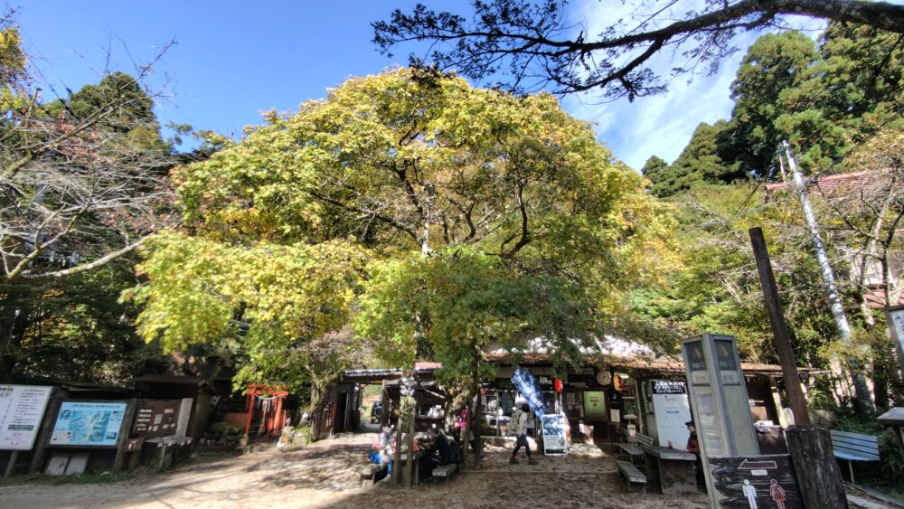 茶山前広場のモミジの大木には黄色や赤いものが少しも混じっていない