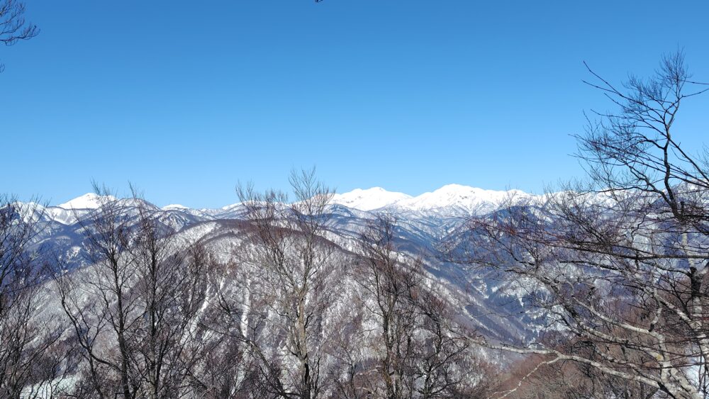 雲一つない青空のもと、両白山地の山並みが美しい
