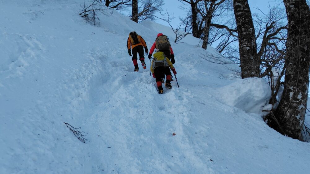 降ってきた方に伺えば雪が締まっているしトレースもしっかりしているので輪カンは無用と