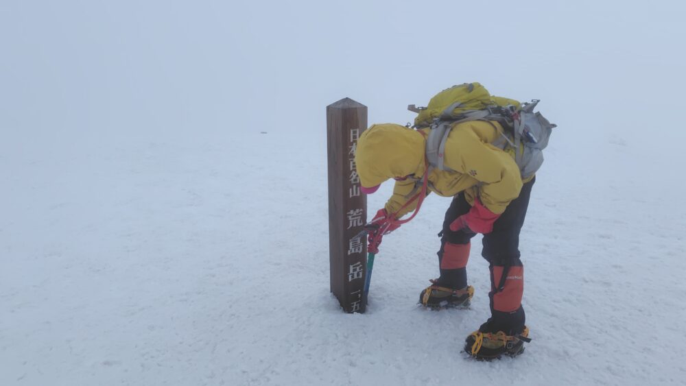 シャクナゲ平鞍部から傾斜の強いところを登り、前荒島岳直下のやや傾斜の落ちた細い尾根辺りでは西側の谷から吹き上げる強い風に時折台風姿勢でやり過ごすほど、そこから先も所々細い尾根や傾斜のあるところを風とスリップに気を付けて慎重に進む