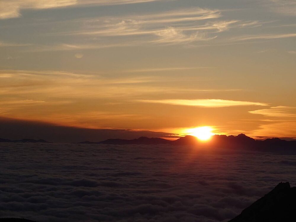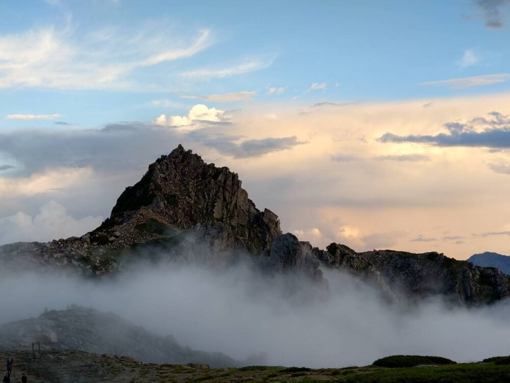 アーベントロートに染まる宝剣岳はまるで外国の山見たい  夕立ちがあり気温が9℃にも