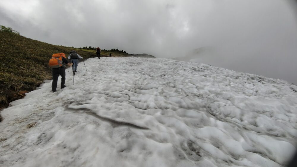 取り付きから斜度30度の雪田をスリップに備えガイドロープよろしく20m程登ったところから雪の解けた夏道へトラバースで抜けることが出来た