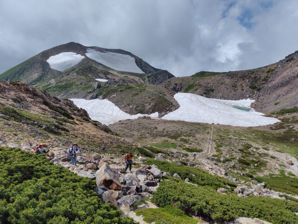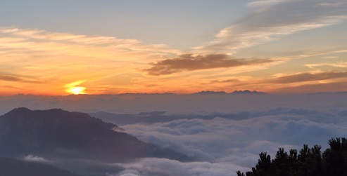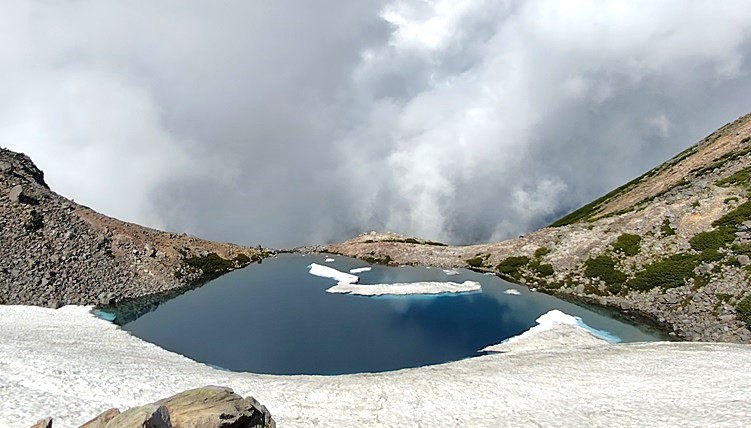 熱低から台風になり列島東海岸に沿って北上、影響は14日頃からとの予報だが、湿った空気の流入と上空の寒気でややこしい天気にならなければいいなと思いつつ入山、12日夜間テントが雨に打たれたという話は翌朝目が覚めてから聞かされた、雨は山行に影響を及ぼすものではなかったが、残雪による影響から当初計画を変更、展望コースのご来光と北アルプスの展望を堪能した。
