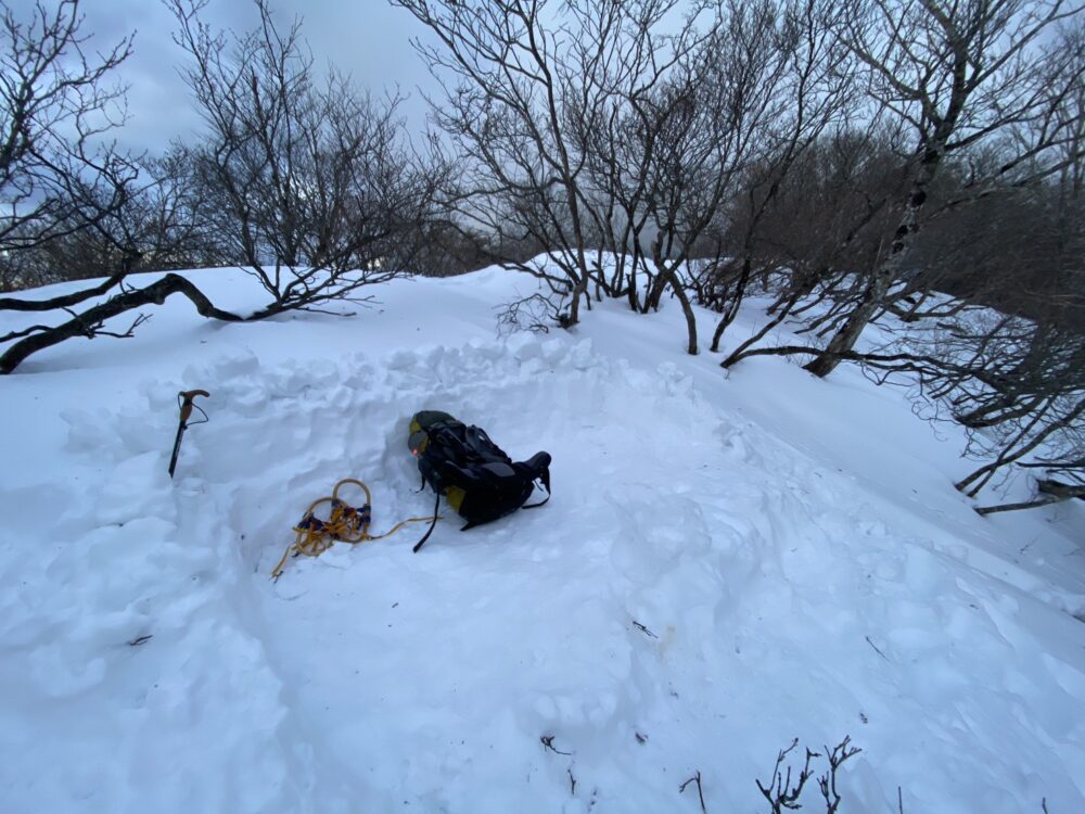 初日はイン谷口から大津ワンゲル道を釈迦岳へ 登り始めの尾根道は日当たりよく暖かく雪解けが進む程、それでも標高700m辺りからは風も強く寒さを感じながら、そろそろ輪カンジキをと思いながらも800mの休憩地点まで粘って装着、更に釈迦岳岳からピークを僅かに北比良峠方面へ進んだところで幕営、一人寂しく幕生活の夜を過ごす