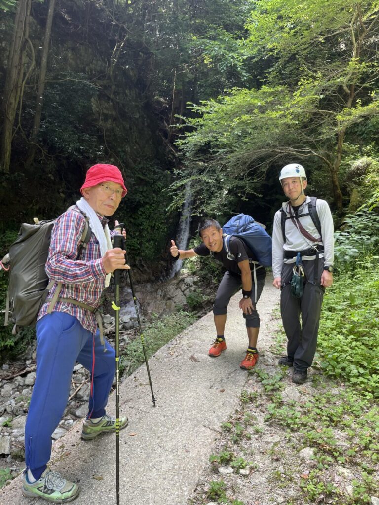 最後に取り付きの滝前まで来ると風が心地よく、おやつを食べて恒例の記念写真を撮って終了。